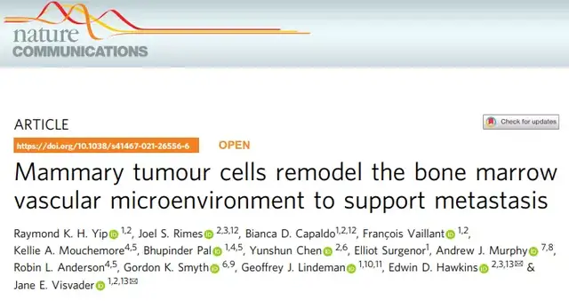 在今年11月份新鮮出爐的《Nature Communications》上的,一篇關(guān)于癌癥轉(zhuǎn)移的文章,揭示了這些尚不明晰的機(jī)制,文章標(biāo)題為:“Mammary tumour cells remodel the bone marrow vascular microenvironment to support metastasis"。